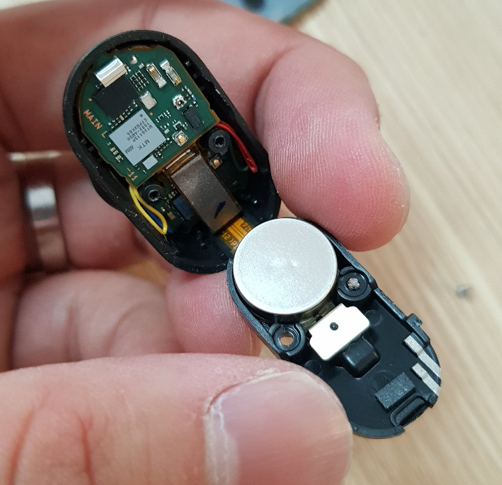 - 나사를 분리하고 살살 들어보면(혹은 1자 드라이버로 살살 들어올려보면 아래와 같이 조개 열리듯 분리가 되는데요. 배터리와 아래 전극이 양면 테이프로 붙어 있습니다. 이 부분을 살살 들어서 분리를 해줍니다.